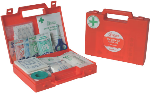 Composition : 5 compresses stériles 20x20cm - 1 bande de gaze 3mx7cm - 1 bande extensible 3mx7cm - 1 pansement compressif stérile 2,5mx6cm - 1 pansement compressif stérile 2,5mx10cm - 1 sachet de 10 pansements adhésifs assortis - 1 rouleau de sparadrap 5mx2cm - 2 compresses alcoolisées - 2 compresses anti-coups - 2 compresses anti-moustiques - 2 sachets anti-brûlures - 2 sachets de savon bactéricide - 1 paire de ciseaux - 1 pince à échardes - 4 clips de fixation pour bandes - 1 paire de gants vinyle - 1 guide premiers secours - Coffret de 23x17x5cm - 400grs